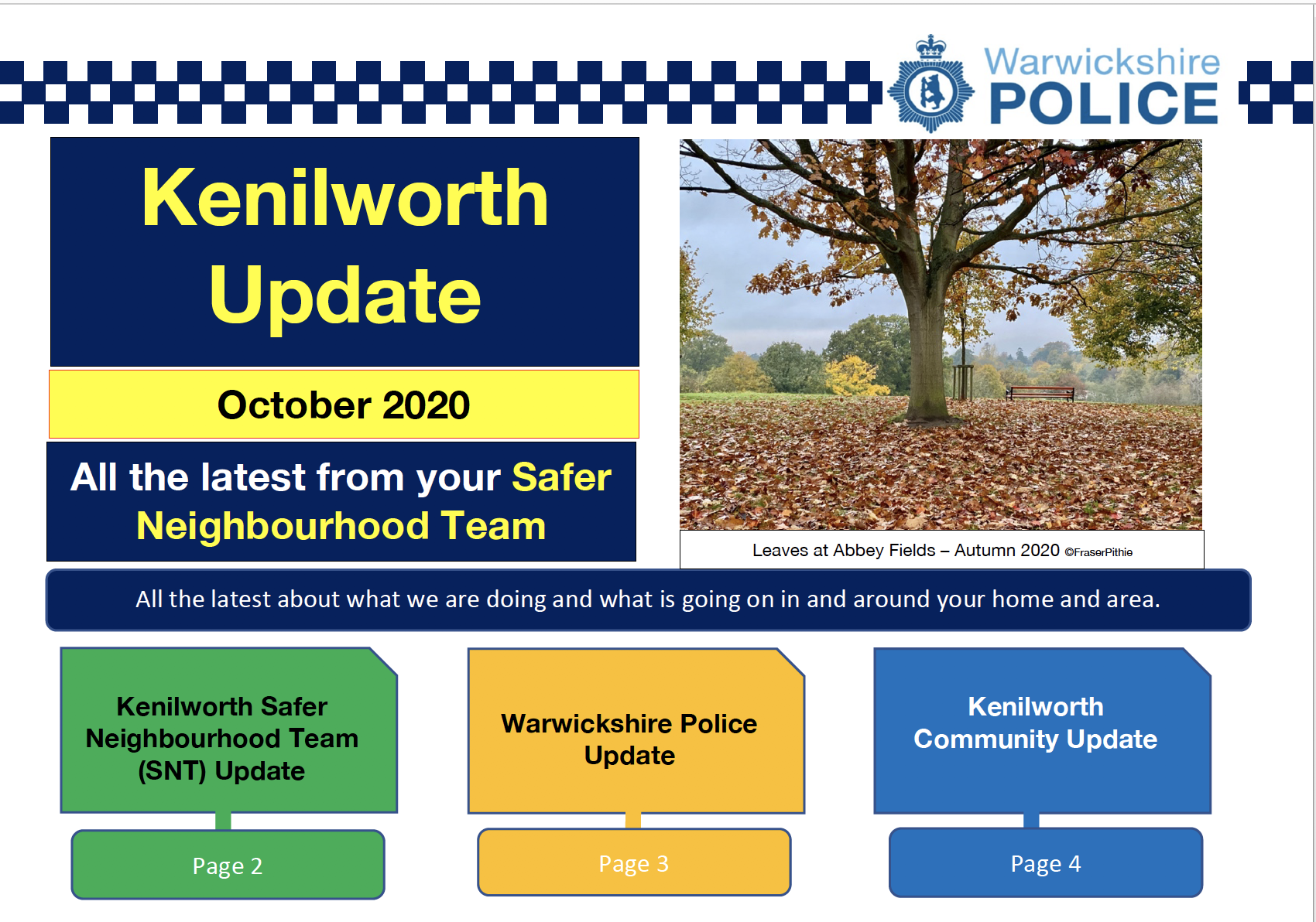 Posted on 28/10/2020 by Fraser PithieKenilworth SNT October Update 2020 The October Update from Kenilworth’s Safer Neighbourhood Team has been published and is here. Please click on the link to open….> snt-kenilworth-newsletter-october-2020Download Share this:Share Click to share on X (Opens in new window) X Like Loading... Related