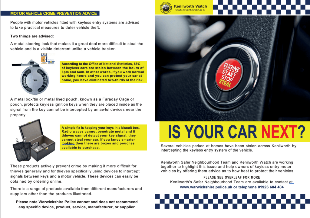 In recent weeks, understandable concerns have arisen following the theft of motor vehicles in Kenilworth outside people’s homes, often from their private drives. The thefts are likely the work of serious organised crime gangs, and Warwickshire Police are working alongside other forces to detect these criminals.